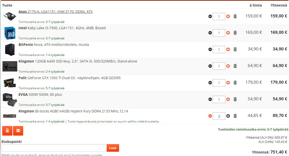 näinhän se kyllä on,mut toi olikin vain tuommoinen nopea kasaus...Kannattaa kattoo coffee lake setti mieluummin, kun tuo ryyni settikin jo menee tehossa ohi tosta i3-7300, ja i3-8100 on 4 ydin 4 thread (vastaa 7 generaation i5). Eli ei kannata ottaa tota vanhan generaation i3 senkään takia